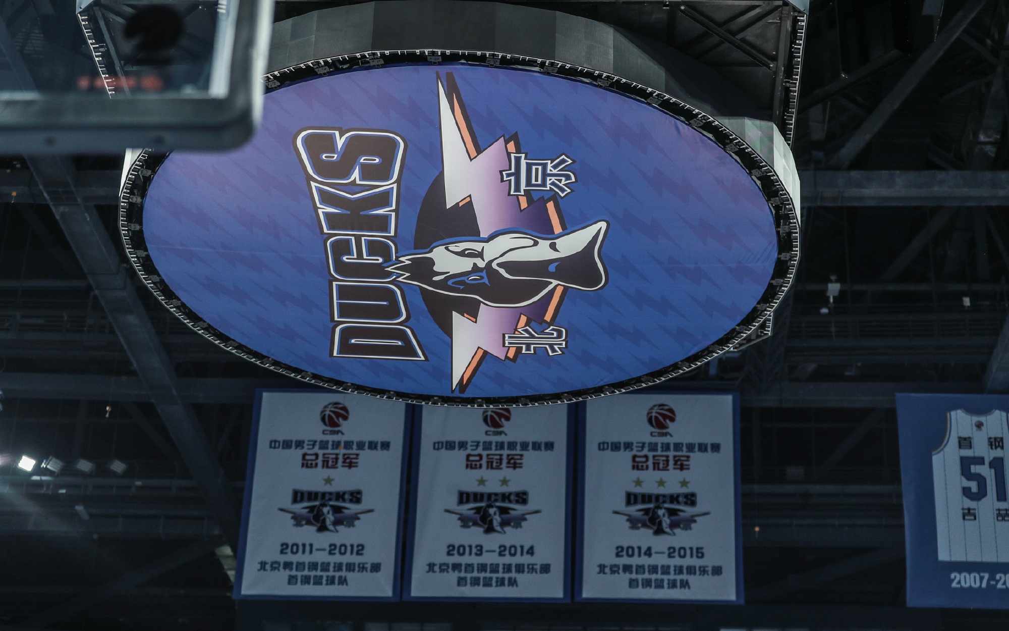五棵松体育馆上空已升起首钢三面总冠军旗帜。图/北京首钢篮球俱乐部