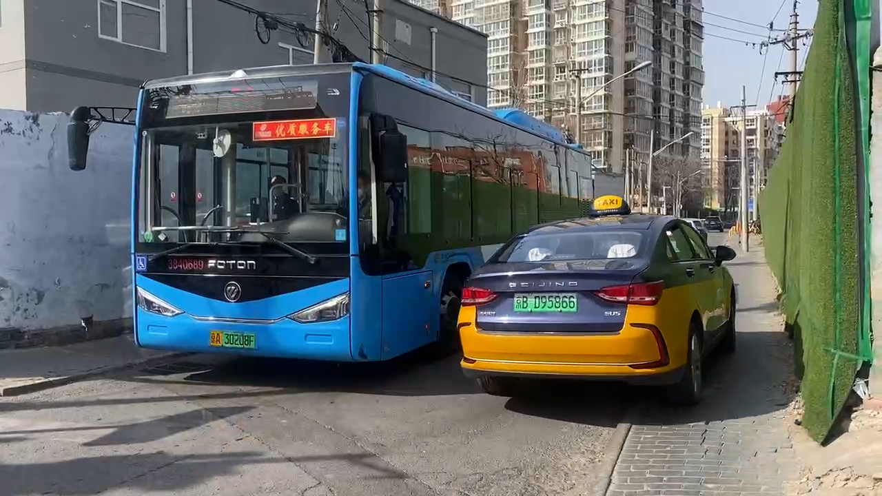丰台区横一条道路较为狭窄,遇到公交车通行时,对向行驶的车辆只得驶上一旁的人行道。新京报记者 陈超 摄