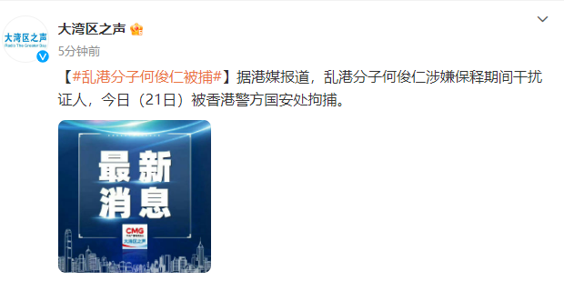 据@大湾区之声微博消息,据港媒报道,乱港分子何俊仁涉嫌保释期间干扰证人,今日(21日)被香港警方国安处拘捕。