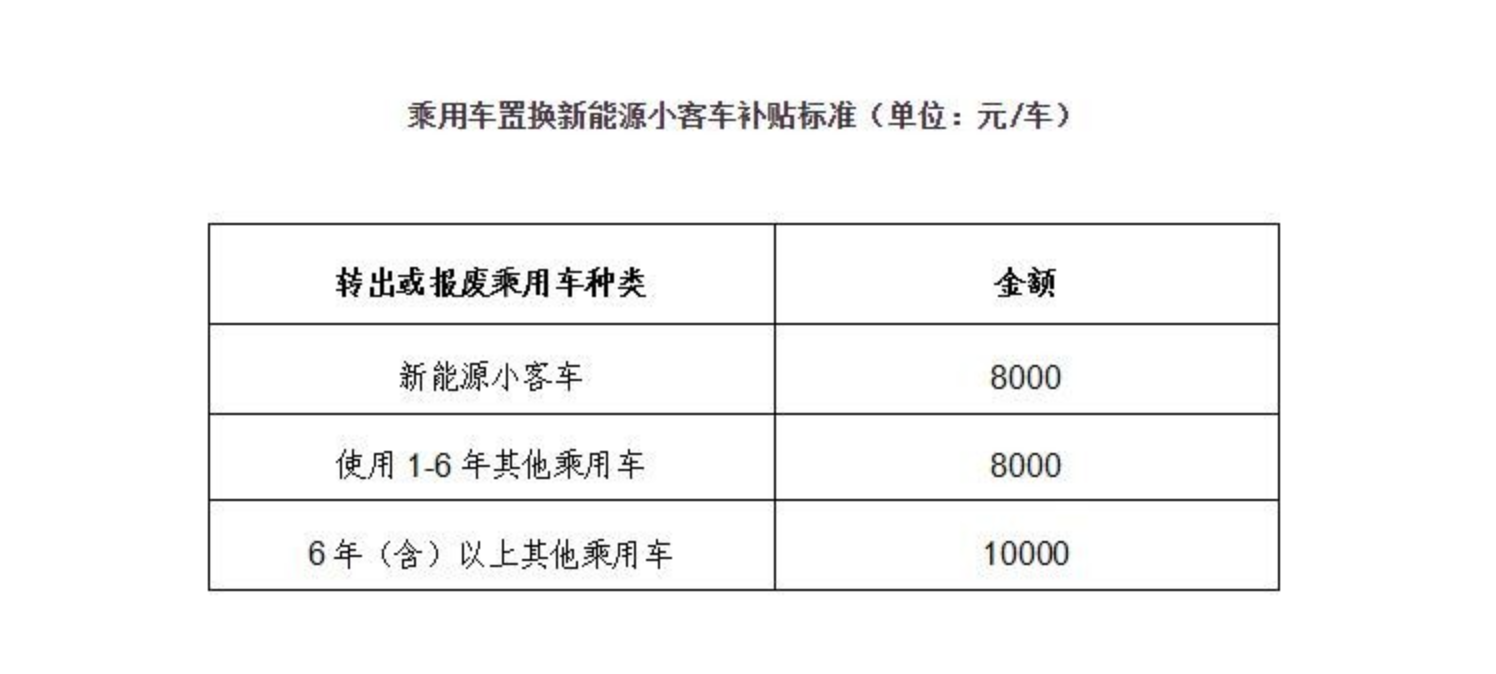 方案指出,车主报废或转出新能源小客车以及报废或转出使用1-6年其他类型乘用车,可以获得8000元/车补贴;报废或转出使用6年(含)以上其他乘用车,则可获得10000元/车补贴。