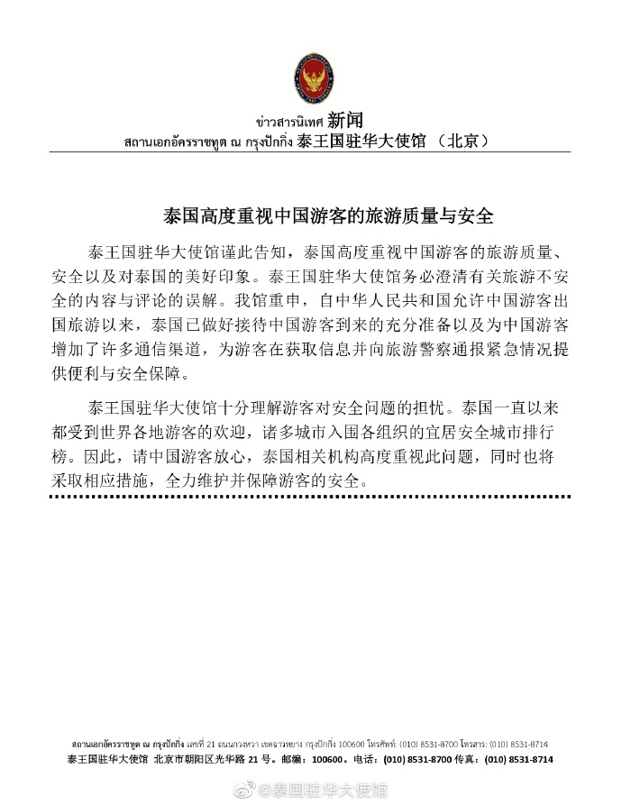 泰国驻华大使馆:泰国高度重视中国游客的旅游质量与安全