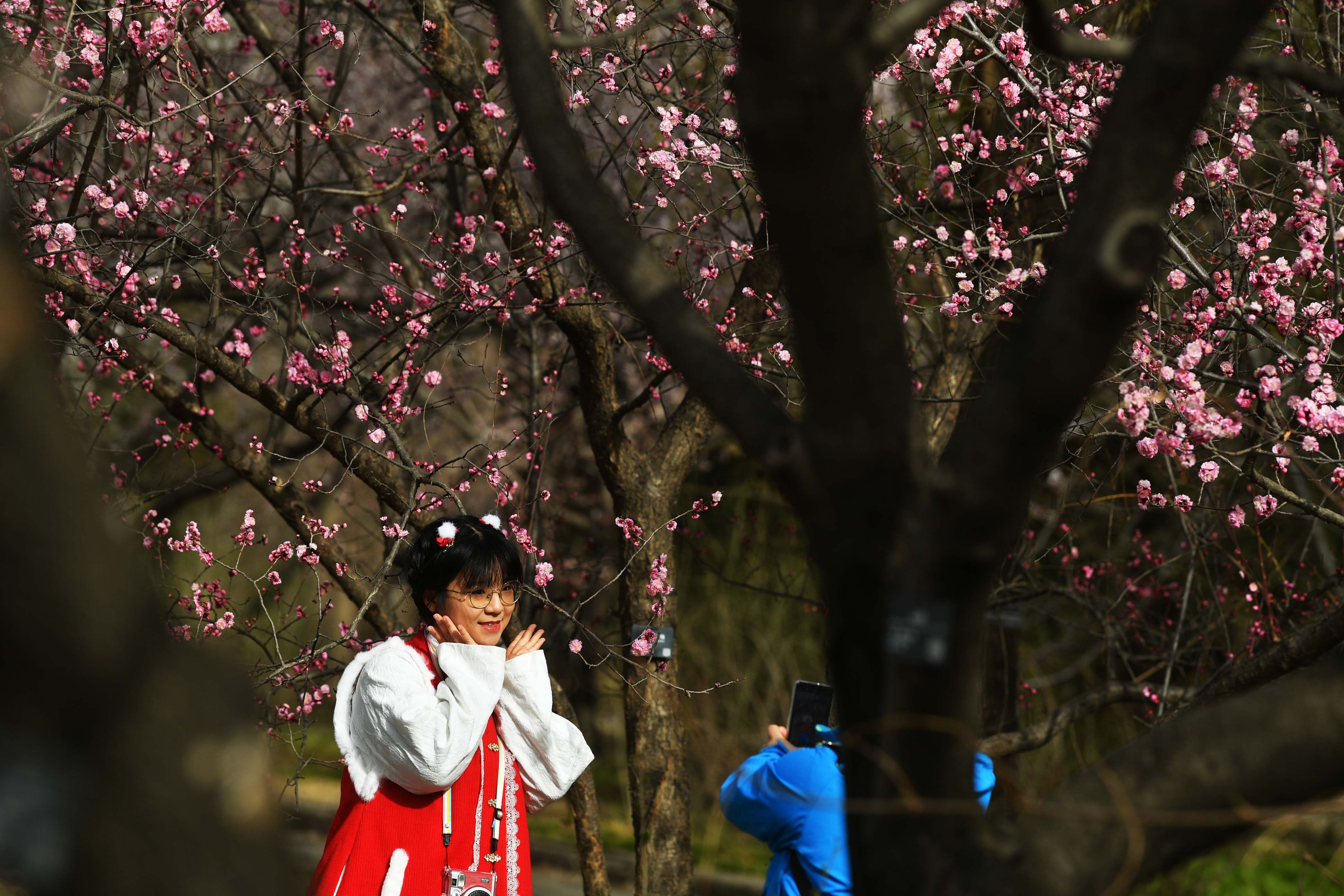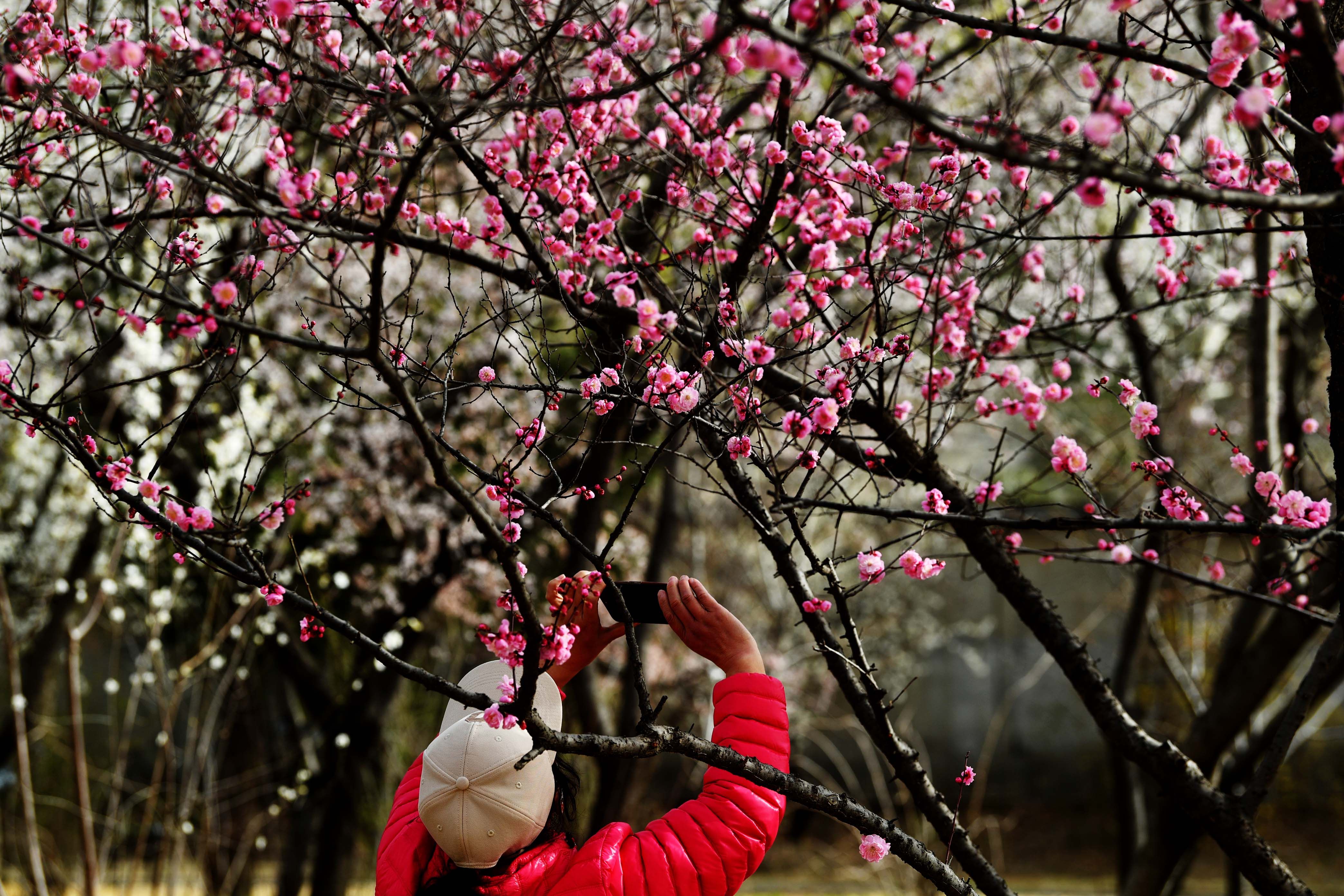 3月24日,国家植物园北园,一位游客拍摄梅花。