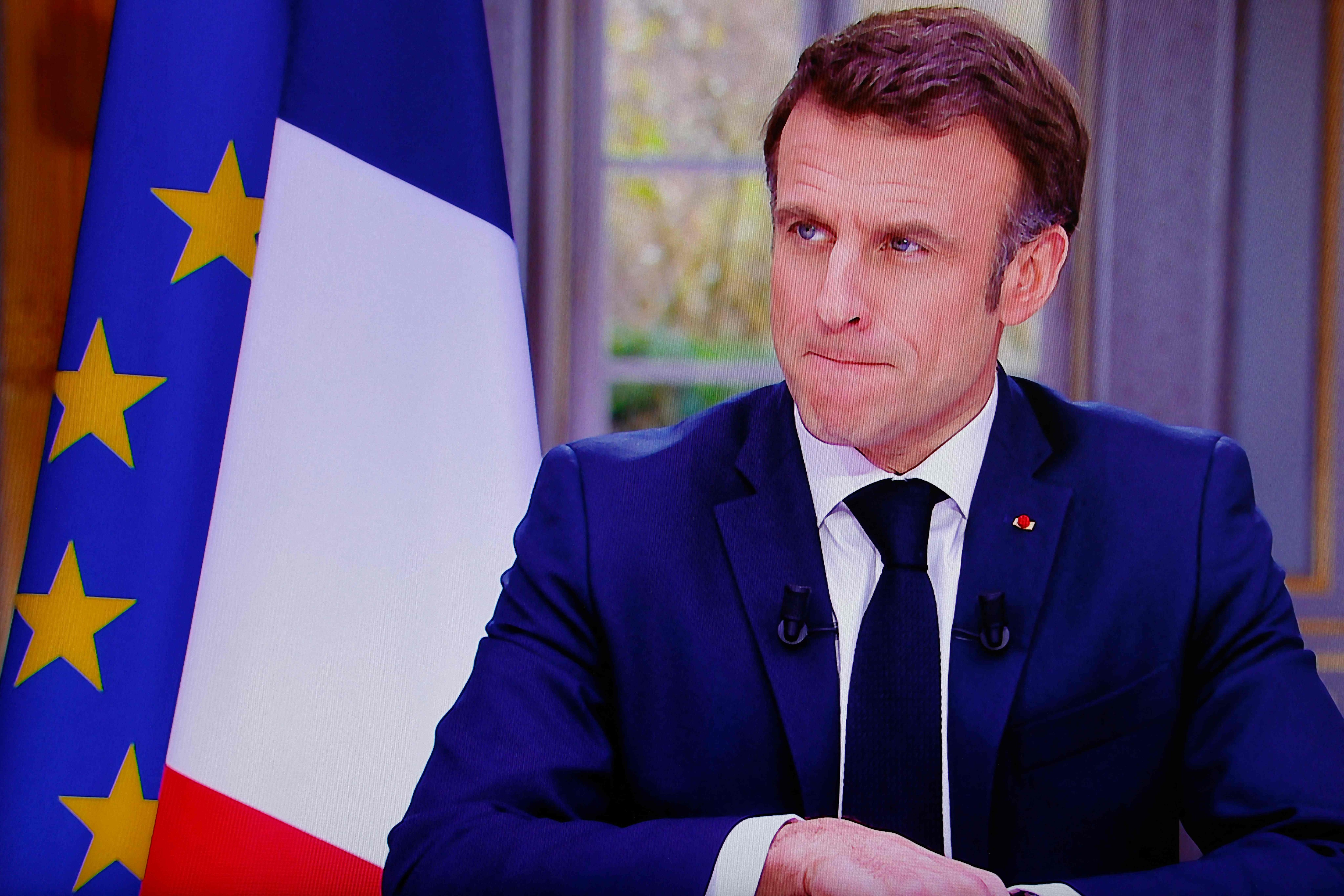 当地时间2023年3月22日,法国总统马克龙在爱丽舍宫接受电视采访时发表讲话。图/视觉中国