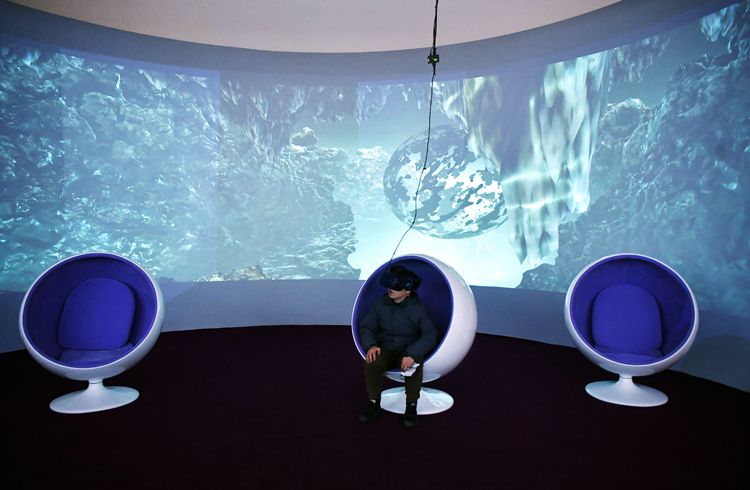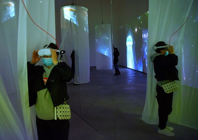 观众戴上VR眼镜体验《水母》展区。