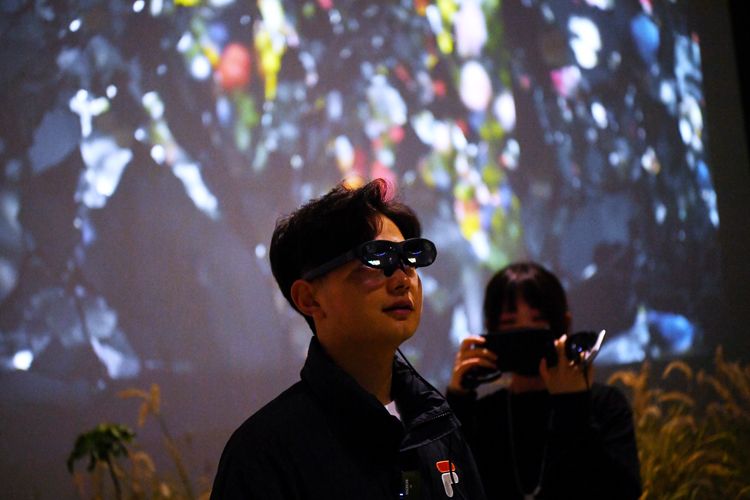 观众戴上AR眼镜体验《勿忘我》展区。