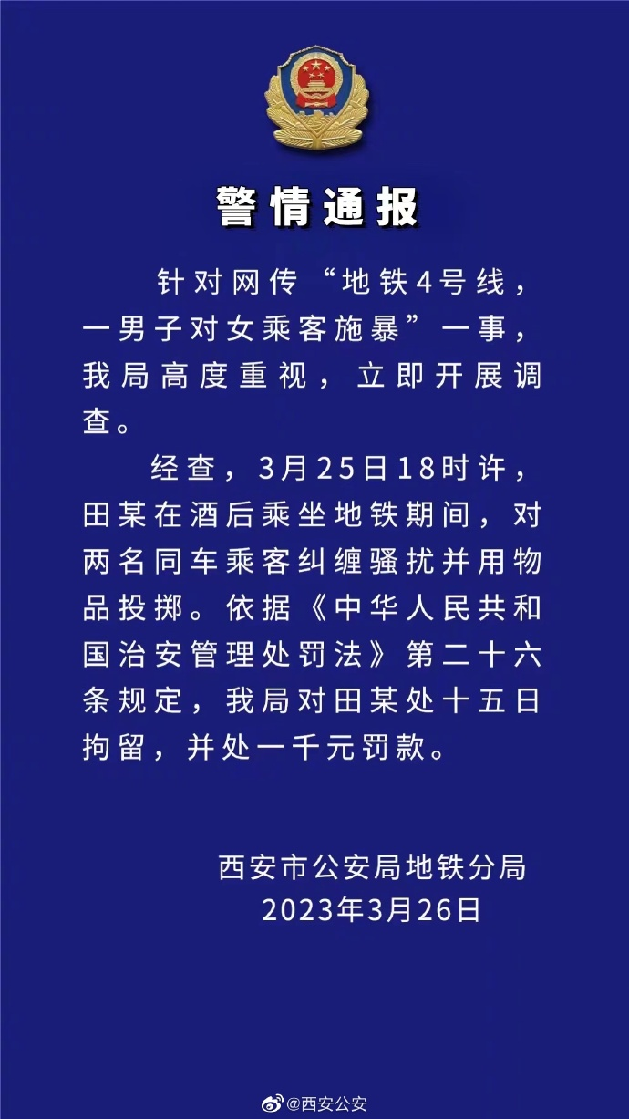 网传“地铁4号线上一男子对女乘客施暴” 西安警方:被拘留并罚款