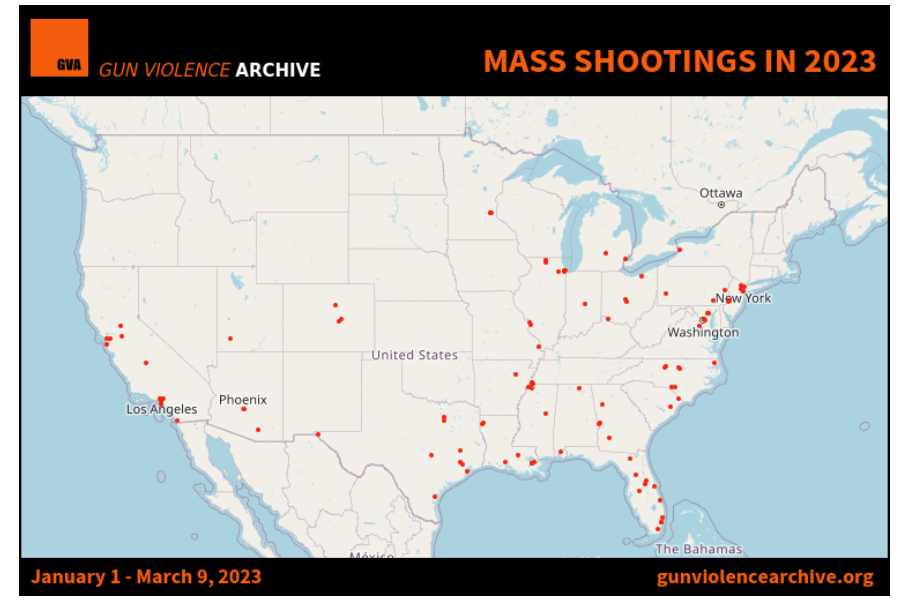 “枪支暴力档案(GUN VIOLENCE ARCHIVE)”网站统计,截至2023年3月20日,美国今年已发生117起大规模枪击事件,造成178人死亡、433人受伤。