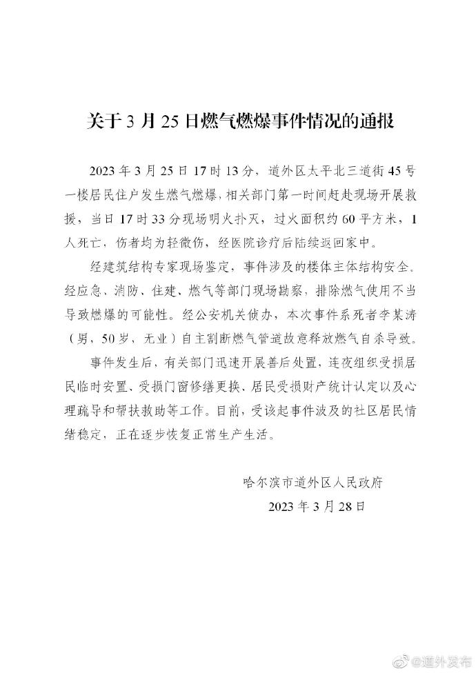 哈尔滨通报燃气燃爆事件:系死者割断燃气管道释放燃气自杀导致