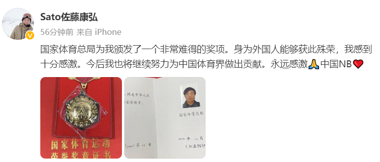 新京报讯 3月28日,苏翊鸣的日籍教练佐藤康弘晒出了国家体育总局为其颁发的荣誉证书,并表示,“身为外国人能够获此殊荣,我感到十分感激。今后我也将继续努力为中国体育界做出贡献。”