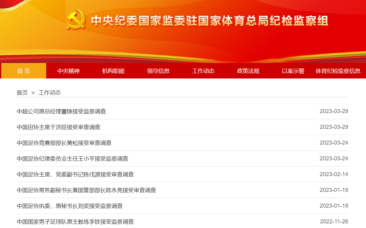 时间线:2022年11月26日 中国男足原主教练李铁接受监察调查2023年1月19日 中国足协执委、原秘书长刘奕接受监察调查2023年1月19日 中国足协常务副秘书长兼国管部部长陈永亮接受审查调查2023年2月14日 中国足协主席、党委副书记陈戌源接受审查调查2023年3月23日 中国足协纪律委员会主任王小平接受监察调查、竞赛部部长黄松接受审查调查2023年3月29日 中国田协主席于洪臣接受审查调查、中超公司原总经理董铮接受监察调查