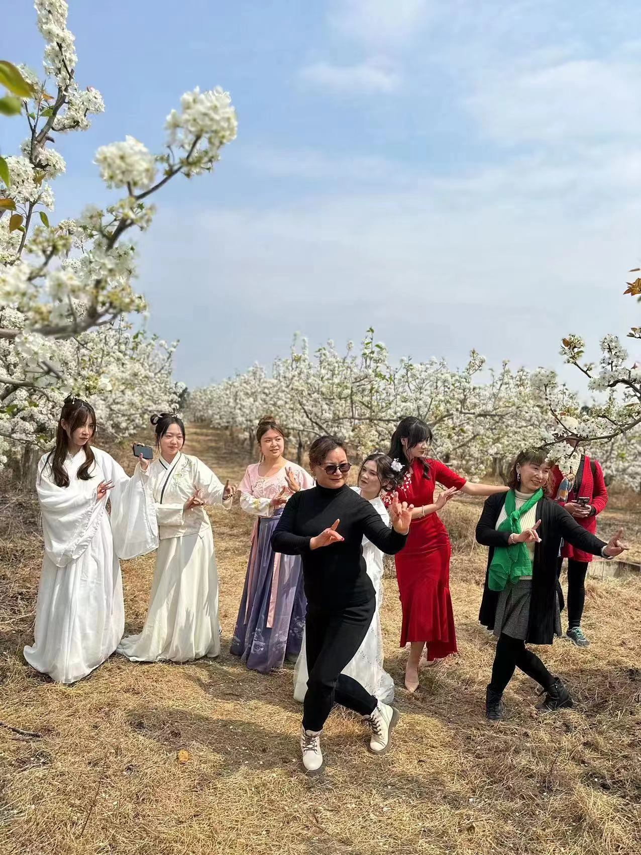 雁塔村是“中国红梨之乡”,村内千亩梨园,满树梨花,好像空中的云挂在枝干上。为了丰富游客体验,开拓游览新形式,雁塔村围绕梨花开展彩妆活动,为游客提供妆造、旅拍服务,游客可以在梨园装扮成自己喜欢的造型,打卡留念。赵全康说:“梨园里有很多穿着汉服或者民族服饰的游客打卡拍照,特别受年轻人喜欢,他们会把打卡图发到社交平台上,让更多人看到我们村庄的美。”