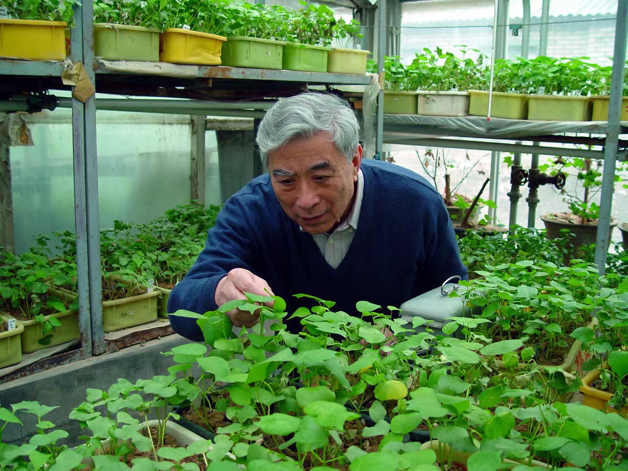 2005年在中国农科院植保所温室,郭予元院士观察棉花上的害虫。中国农科院植保所供图
