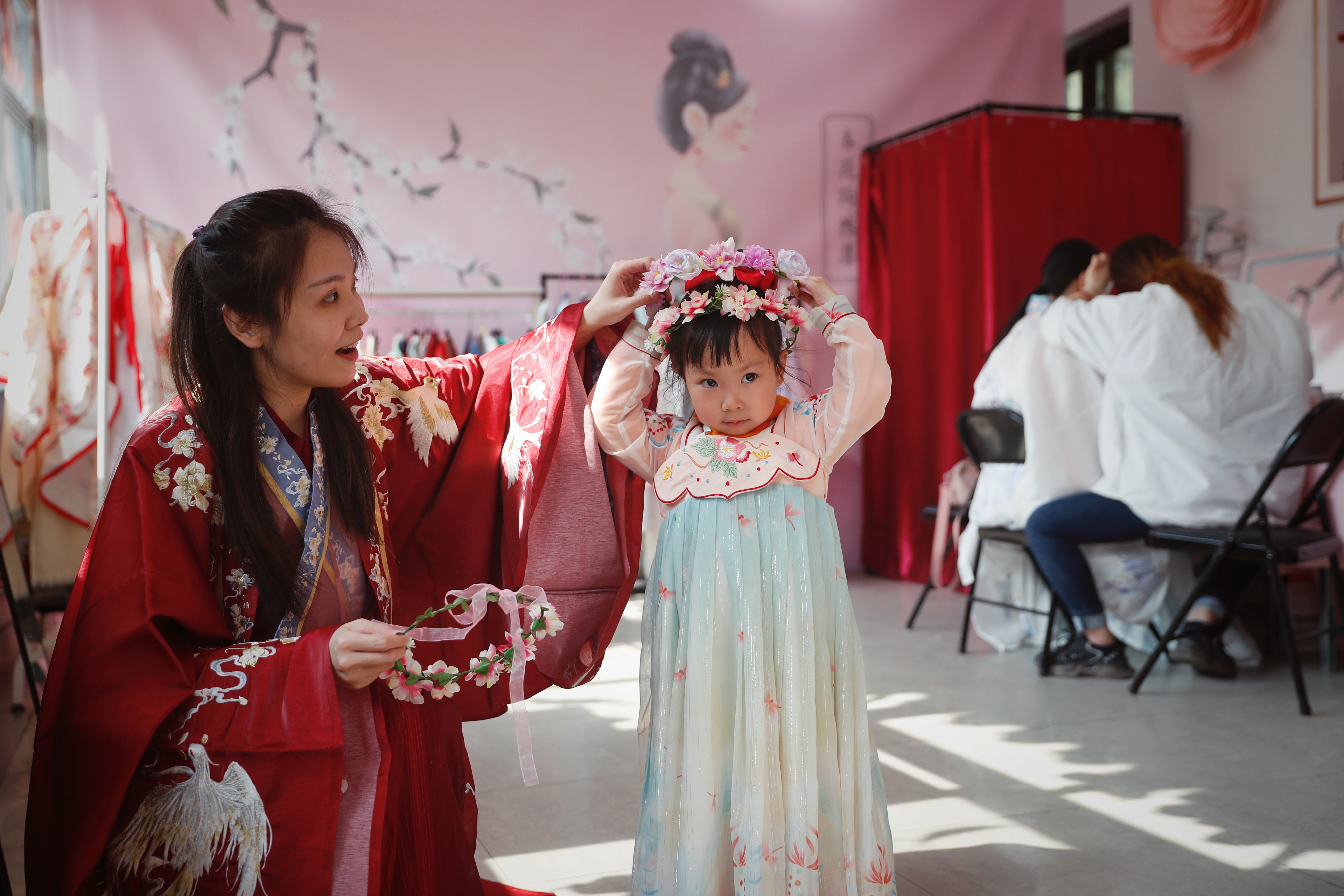 3月30日,陶然亭公园第八届海棠春花文化节上,一位女士带着孩子体验汉服文化。 新京报记者 薛珺 摄