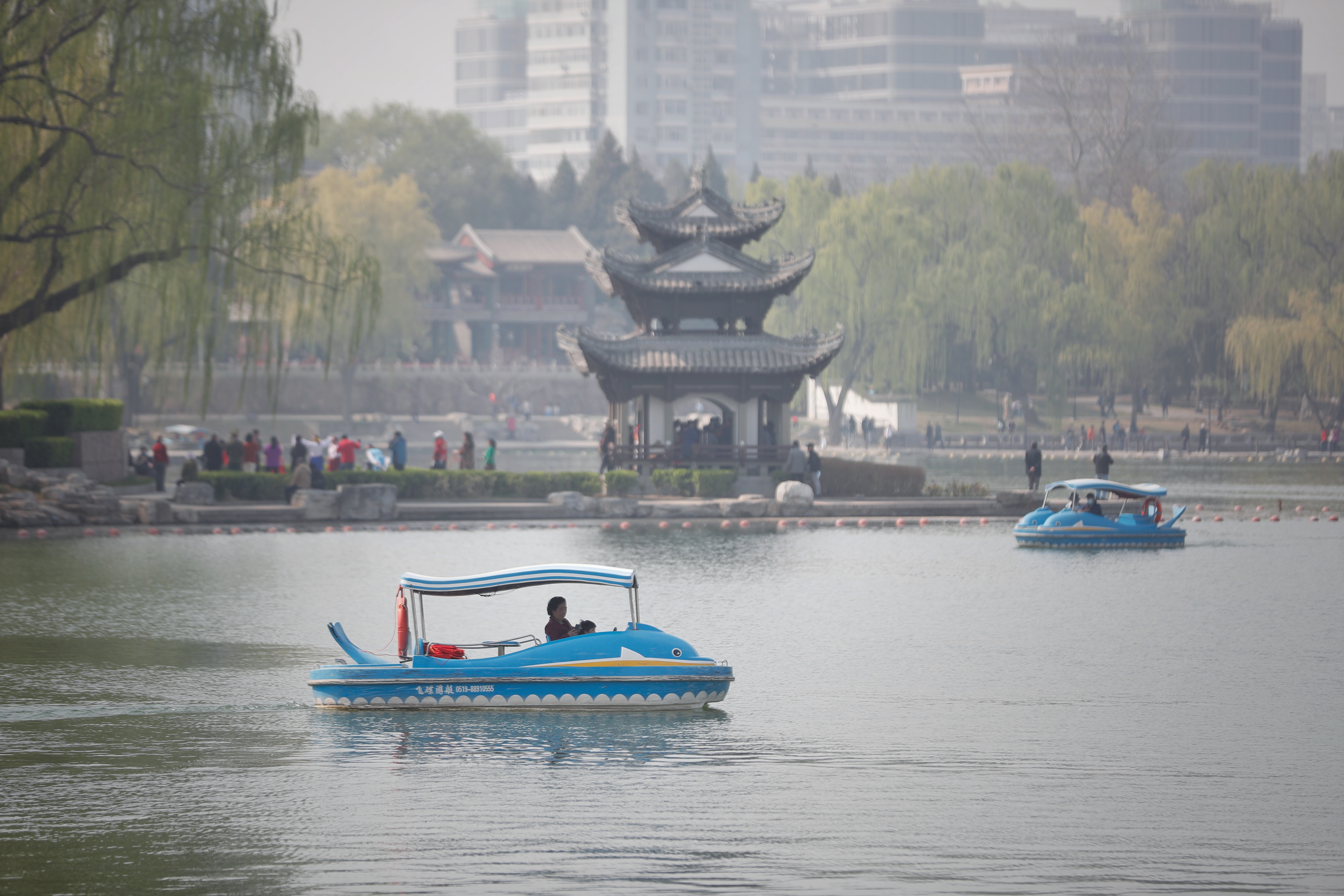 3月30日,陶然亭公园第八届海棠春花文化节上,不少游客乘船游园。 新京报记者 薛珺 摄