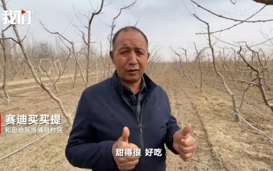 新疆和田地区洛浦县一片桃林边,村民赛迪买买提夸赞着引进的平谷大桃。 新京报我们视频截图