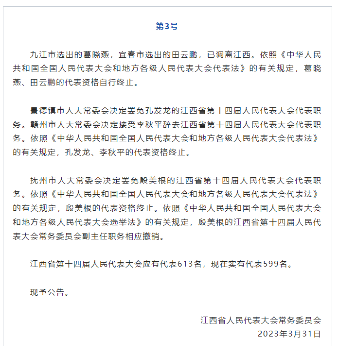 新京报讯 据江西人大微信公众号消息,3月31日,江西省人民代表大会常务委员会发布公告称,赣州市人大常委会决定接受李秋平辞去江西省第十四届人民代表大会代表职务。依照《中华人民共和国全国人民代表大会和地方各级人民代表大会代表法》的有关规定,其代表资格终止。