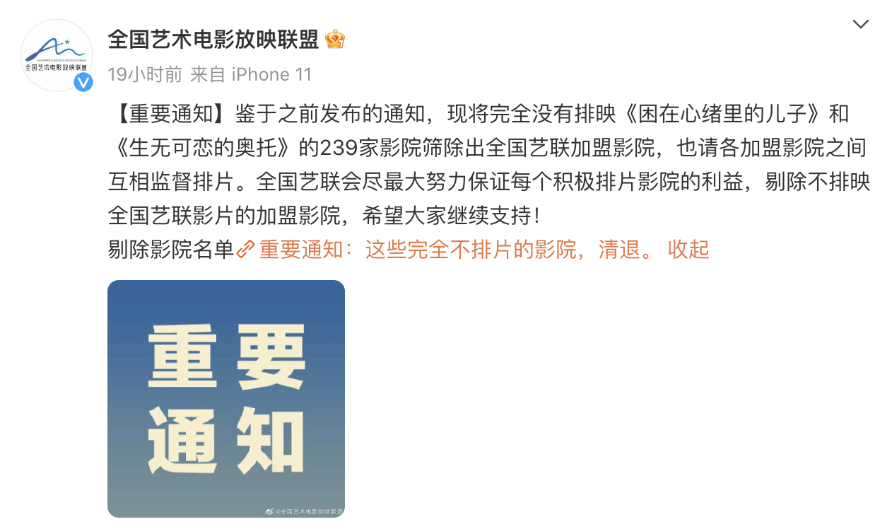 新京报讯(记者周慧晓婉)3月31日,全国艺术电影放映联盟(简称全国艺联)发布重要通知,将完全没有排映《困在心绪里的儿子》和《生无可恋的奥托》的239家影院筛除出全国艺联加盟影院,也请各加盟影院之间互相监督排片。通知表示,全国艺联会尽最大努力保证每个积极排片影院的利益,剔除不排映全国艺联影片的加盟影院,希望大家继续支持。