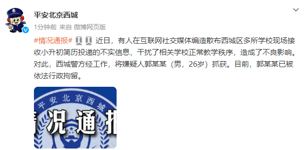 北京西城警方辟谣“多校现场接收小升初简历”:造谣男子被行拘