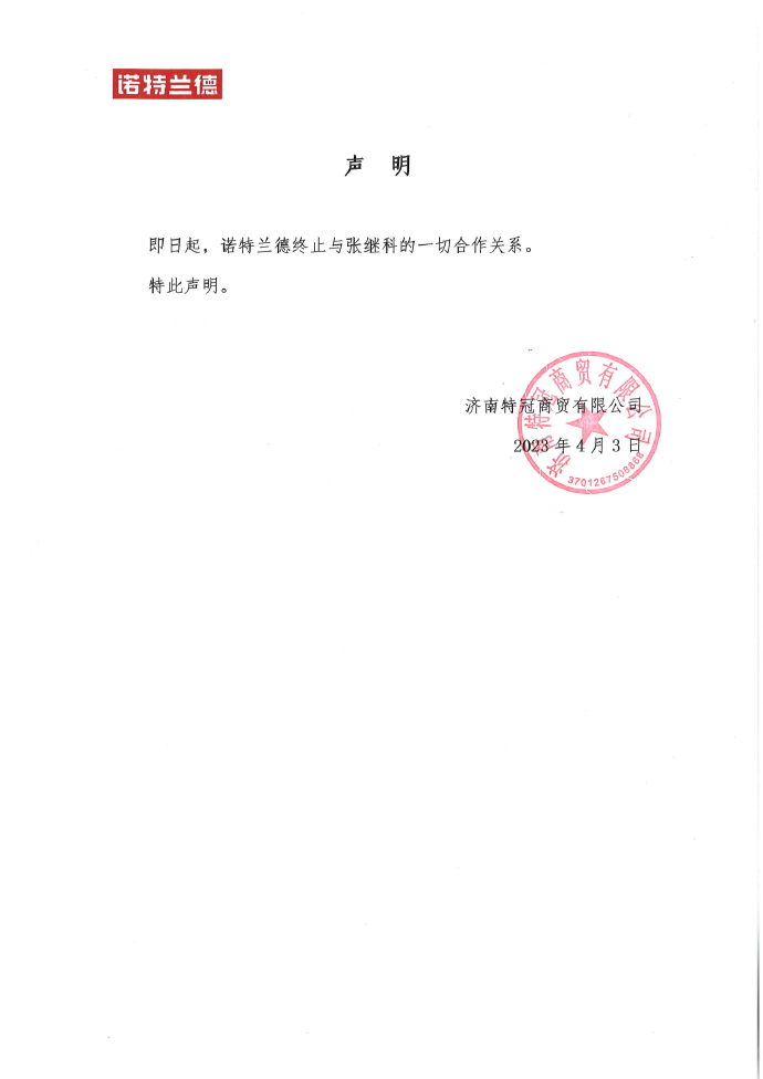 新京报讯 4月3日,诺特兰德发布声明,称即日起,诺特兰德终止与张继科的一切合作关系。