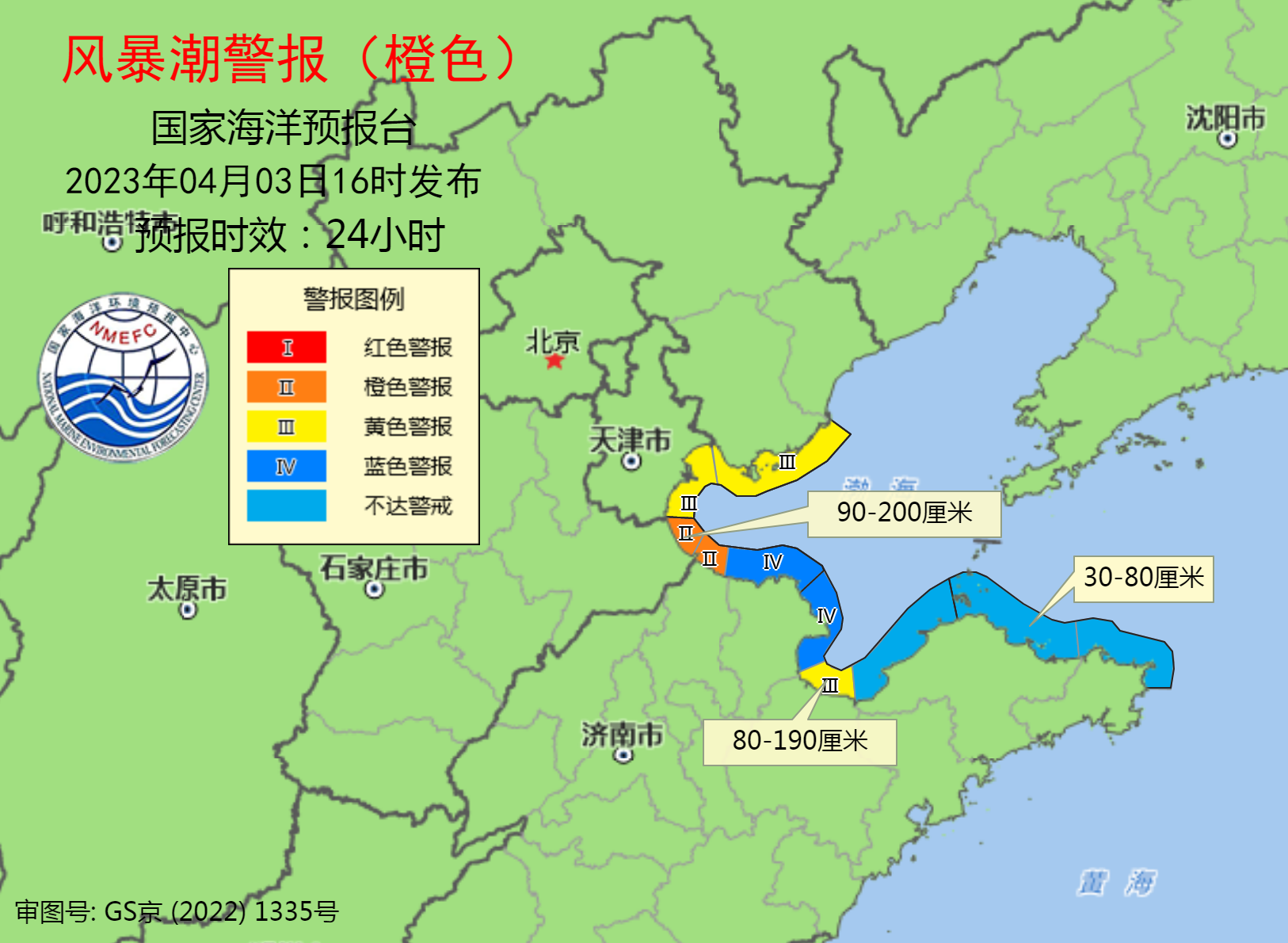风暴潮方面,预计4月3日夜间至5日凌晨,渤海湾将出现90厘米到200厘米的风暴增水,莱州湾将出现80厘米到190厘米的风暴增水,山东半岛北部沿海将出现30厘米到80厘米的风暴增水。河北沧州市和山东滨州市的风暴潮预警级别为橙色,河北唐山市、天津市和山东潍坊市的风暴潮预警级别为黄色,山东东营市的风暴潮预警级别为蓝色。