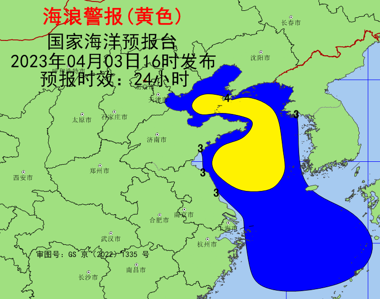 海浪方面,预计4月3日夜间到4日白天,渤海、黄海、东海北部将出现3米到4.5米的大浪到巨浪区;河北、山东近岸海域将出现2.5米到3.8米的大浪,该近岸海域海浪预警级别为黄色,天津、江苏、上海、浙江北部近岸海域将出现2米到3.4米的中浪到大浪,该近岸海域海浪预警级别为蓝色。