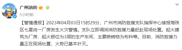 据羊城晚报消息,4月3日下午,广州消防发布一则警情通报称,4月3日15时29分,广州市消防救援支队指挥中心接报海珠区七星岗一厂房发生火灾警情。支队立即调派消防救援力量赶赴现场处置。起火建筑为厂房,起火部位为3层的生产车间,主要燃烧物为布料等。目前,消防救援力量正在现场处置,火势已基本扑灭。