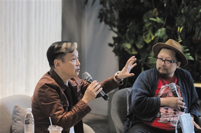 4月2日,沙龙“细诉50载电影生涯”现场,嘉宾陈德森、史航。(新京报记者 王嘉宁 摄)
