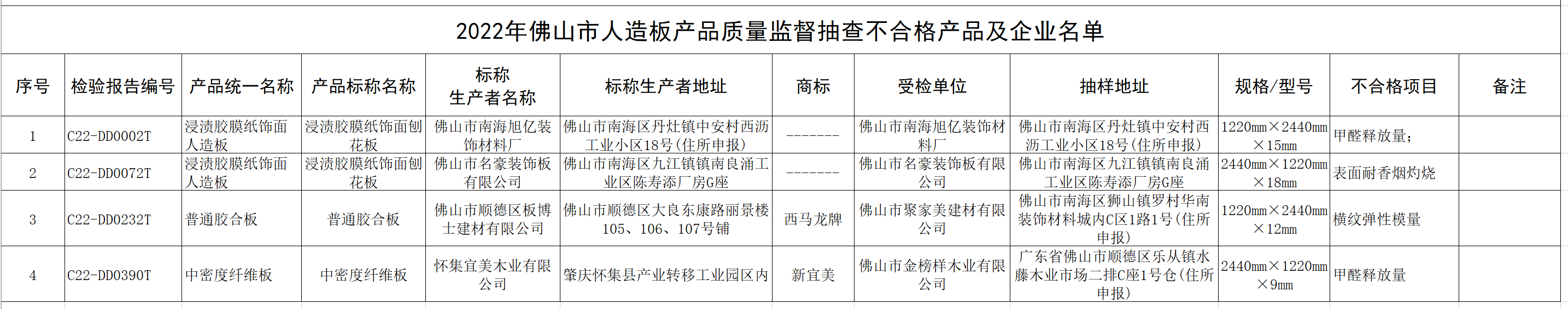 新京报讯(记者张洁)4月4日,新京报记者从佛山市市场监督管理局获悉,在2022年佛山市人造板产品质量监督抽查中,线下销售环节有1款人造板产品不合格,生产环节有3款不合格,不合格发现率为7.27%。其中,“新宜美”中密度纤维板甲醛释放量超标。