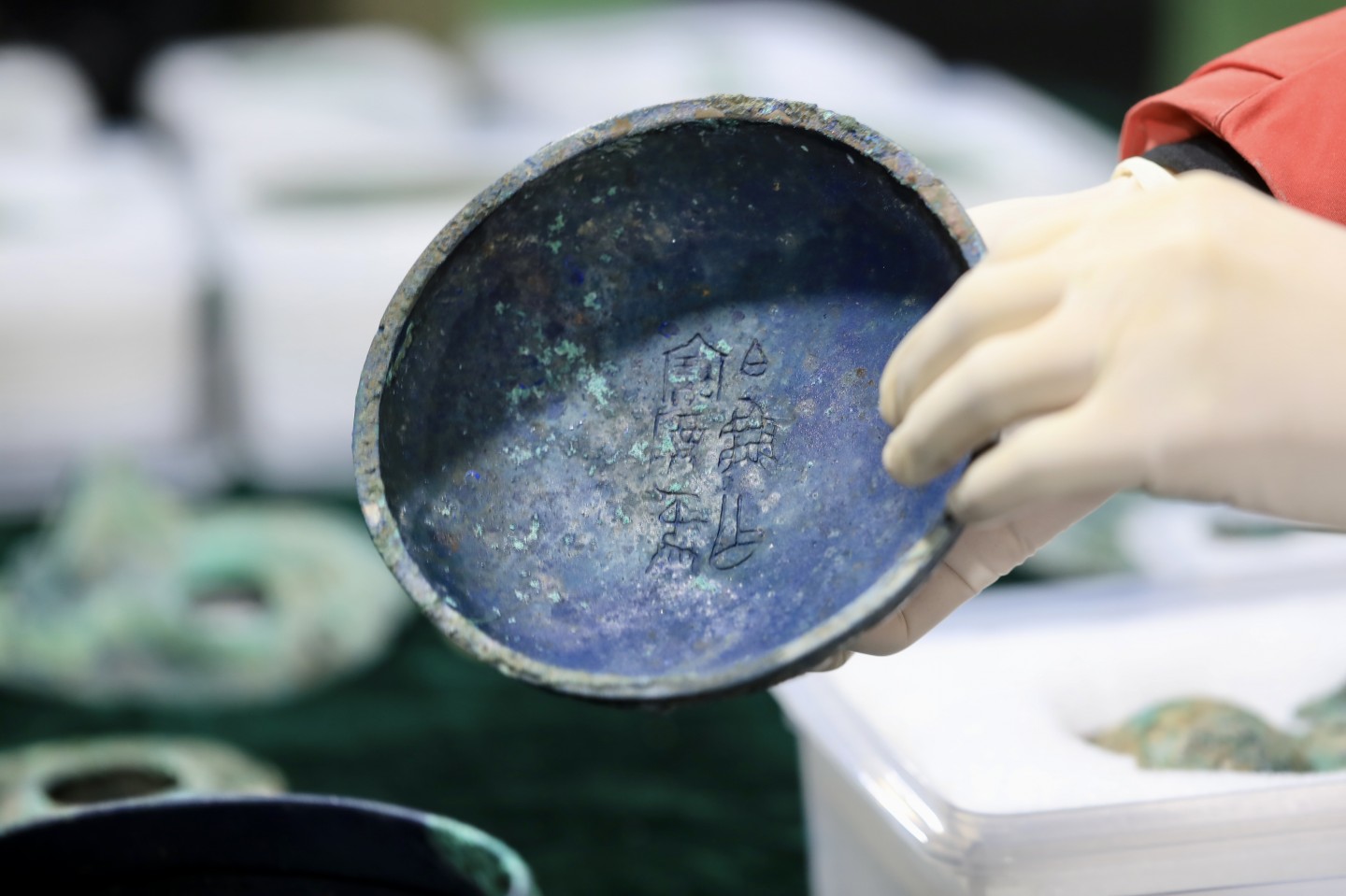 M1901出土的铜簋,器盖内铭文为“白(伯)鱼作宝尊彝”。资料图片/新京报记者 浦峰 摄