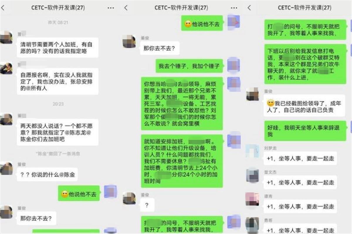 据多张聊天截图显示,中国电科成都事业部一副经理通知清明节需要两人加班,因无员工主动报名,其随即指定了两人。被指定的员工陈某某在群聊中明确表示拒绝加班,并将自己在过去一段时间加班的怨气一并发出,引起了部门同事共鸣,众人纷纷要求辞职。