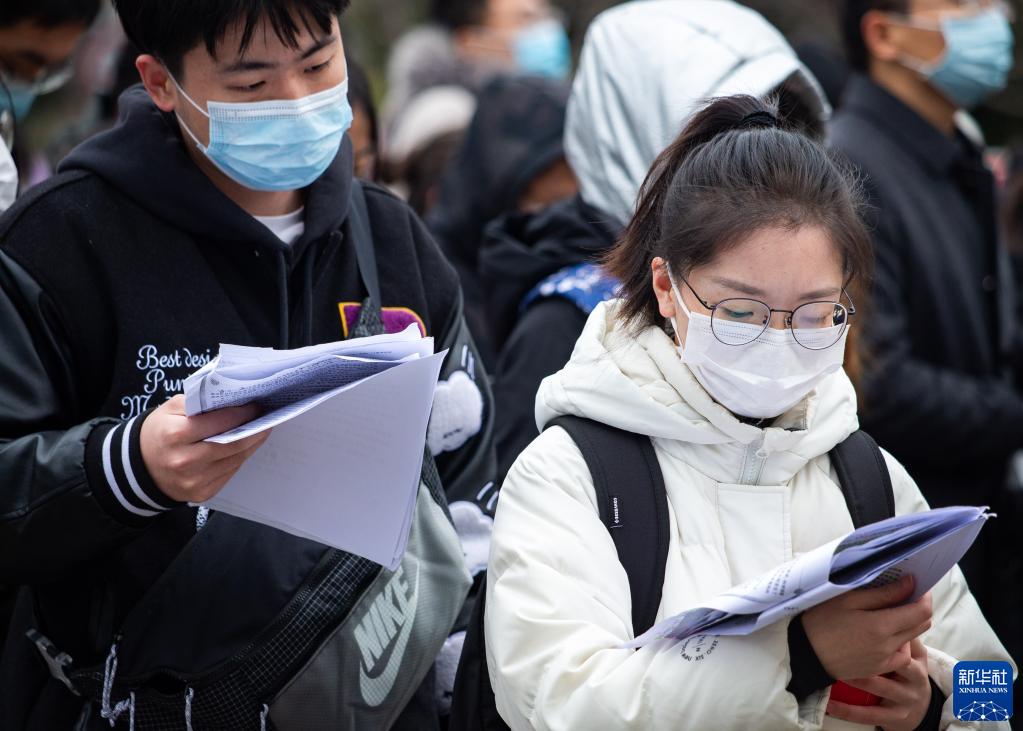 ▲在某硕士研究生招生考试考点,考生在等候入场时复习。图/新华社