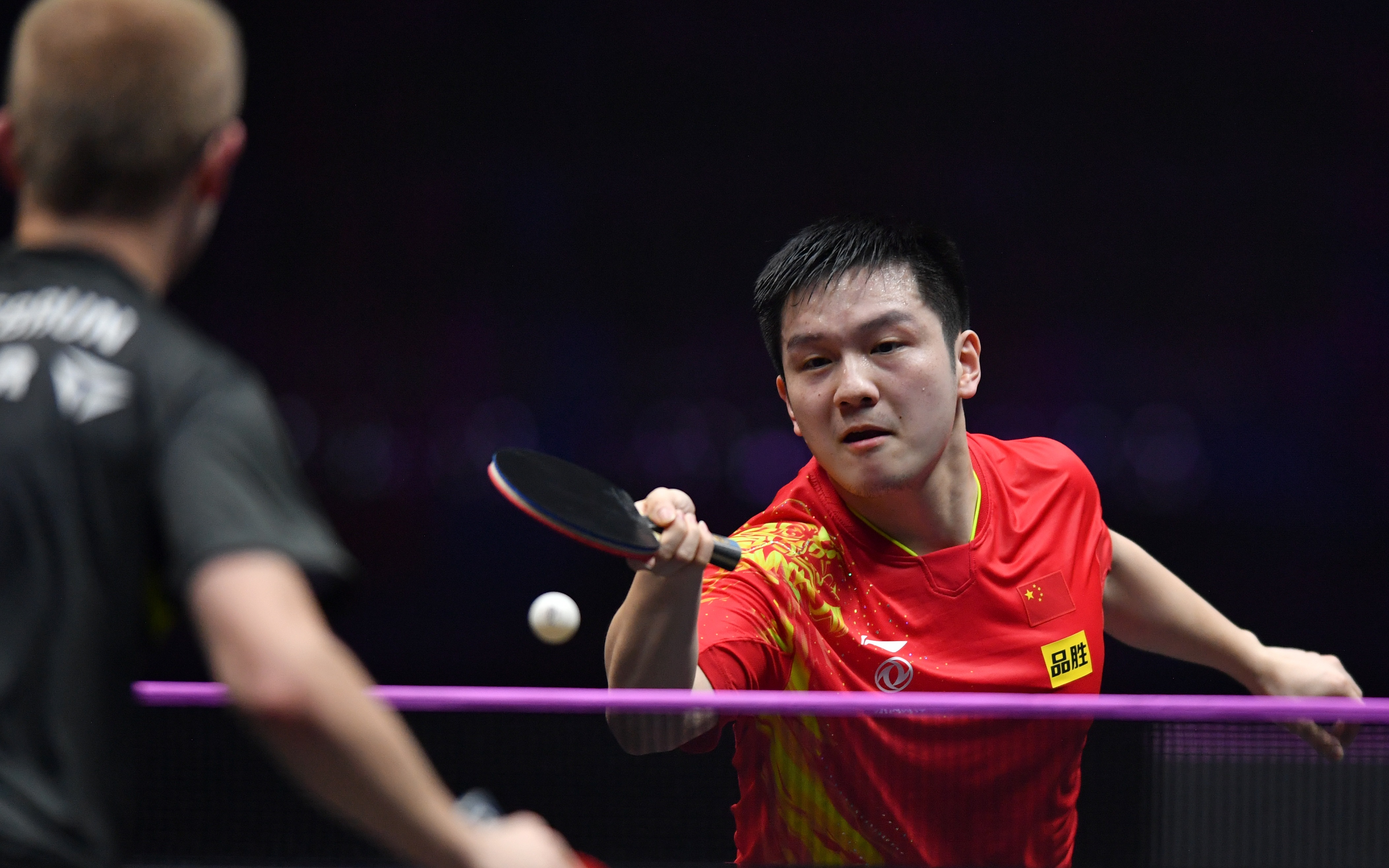 首轮比赛,世界第一樊振东是国乒队最晚出场的队员,首轮对手是法国球员费利克斯·勒布伦。前两局,勒布伦还能努力跟上樊振东的节奏咬住比分,第3局则仅拿到5分。