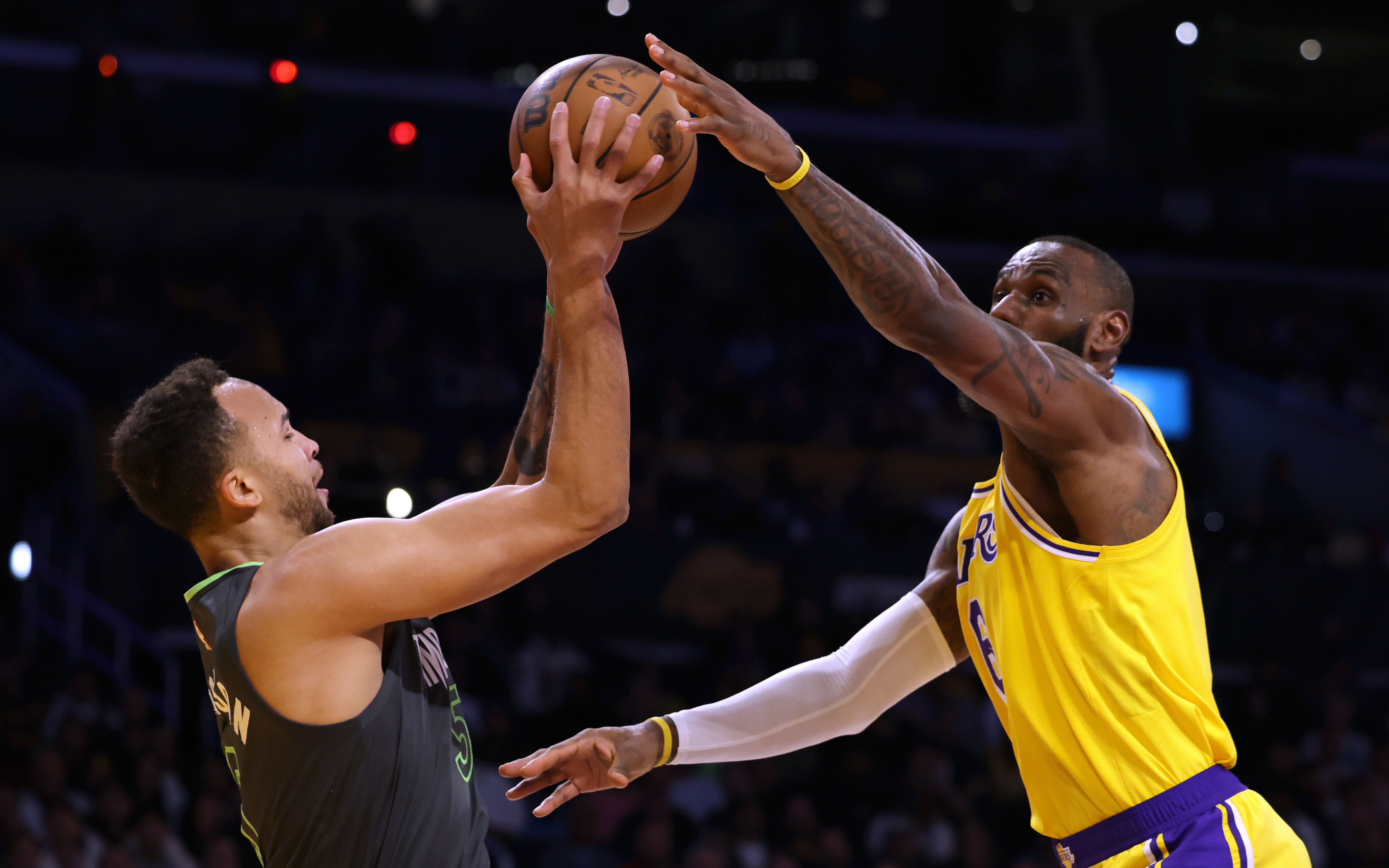 李凯尔投篮时遭到詹姆斯严防。 图/视觉中国