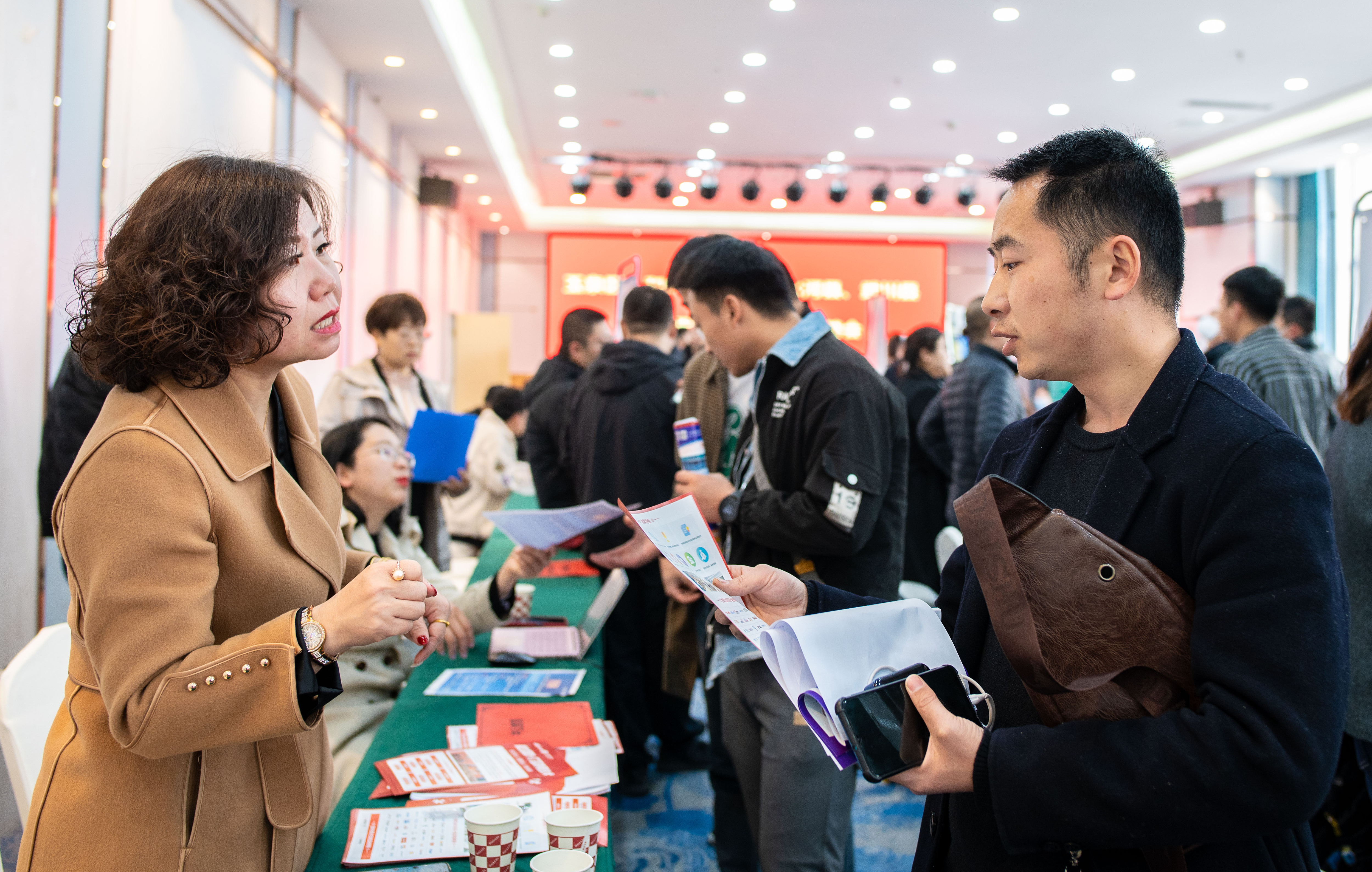 3月24日,内蒙古呼和浩特,求职者在退役军人、军属专场招聘会上与用人单位洽谈。图/视觉中国