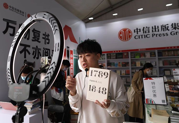 4月14日,书市上,出版社工作人员直播卖书。2023北京书市,以朝阳公园为主展场,同步开启全市“16+1”区、北京图书大厦等四大书城、京东等三大线上分展场。其展场规模、参与范围,均超过往届。