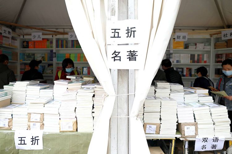 4月14日,书市上,商家打折促销。2023北京书市举办期间,将推出“文化北京·大美中轴”“春有书海·阅读悦美”“阅鉴经典·悦见春天”“你好,读者”等百余场主题活动。