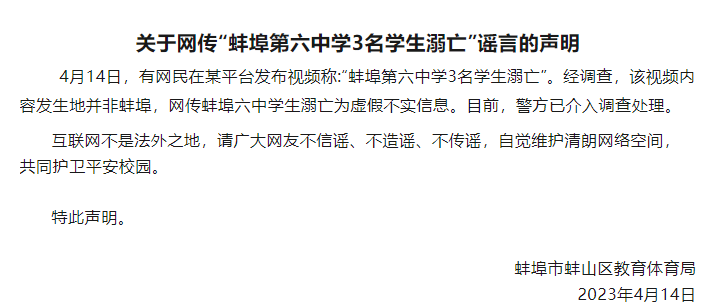 网传“蚌埠第六中学3名学生溺亡”,官方:不实信息,警方已介入
