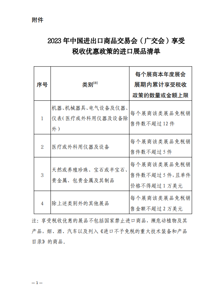 一、对2023年举办的广交会在商务部确定的展期内销售的免税额度内的进口展品免征进口关税、进口环节增值税和消费税。每个展商在本年度展会展期内累计享受税收优惠的展品类别、销售数量或金额上限按附件规定执行。