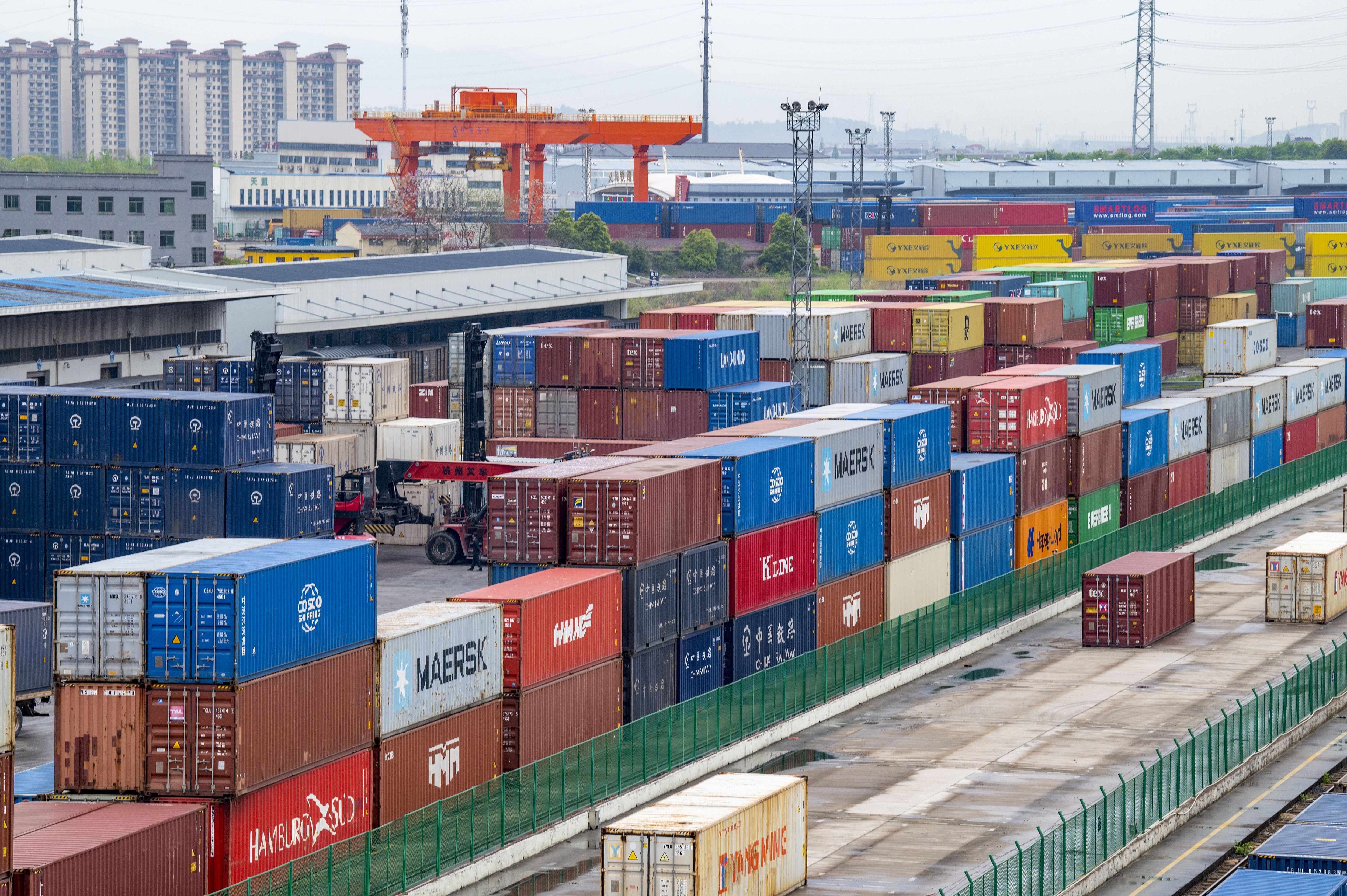 4月4日上午,浙江义乌,铁路口岸的货场上堆满了等待发运的集装箱。图/新华视觉/视觉中国