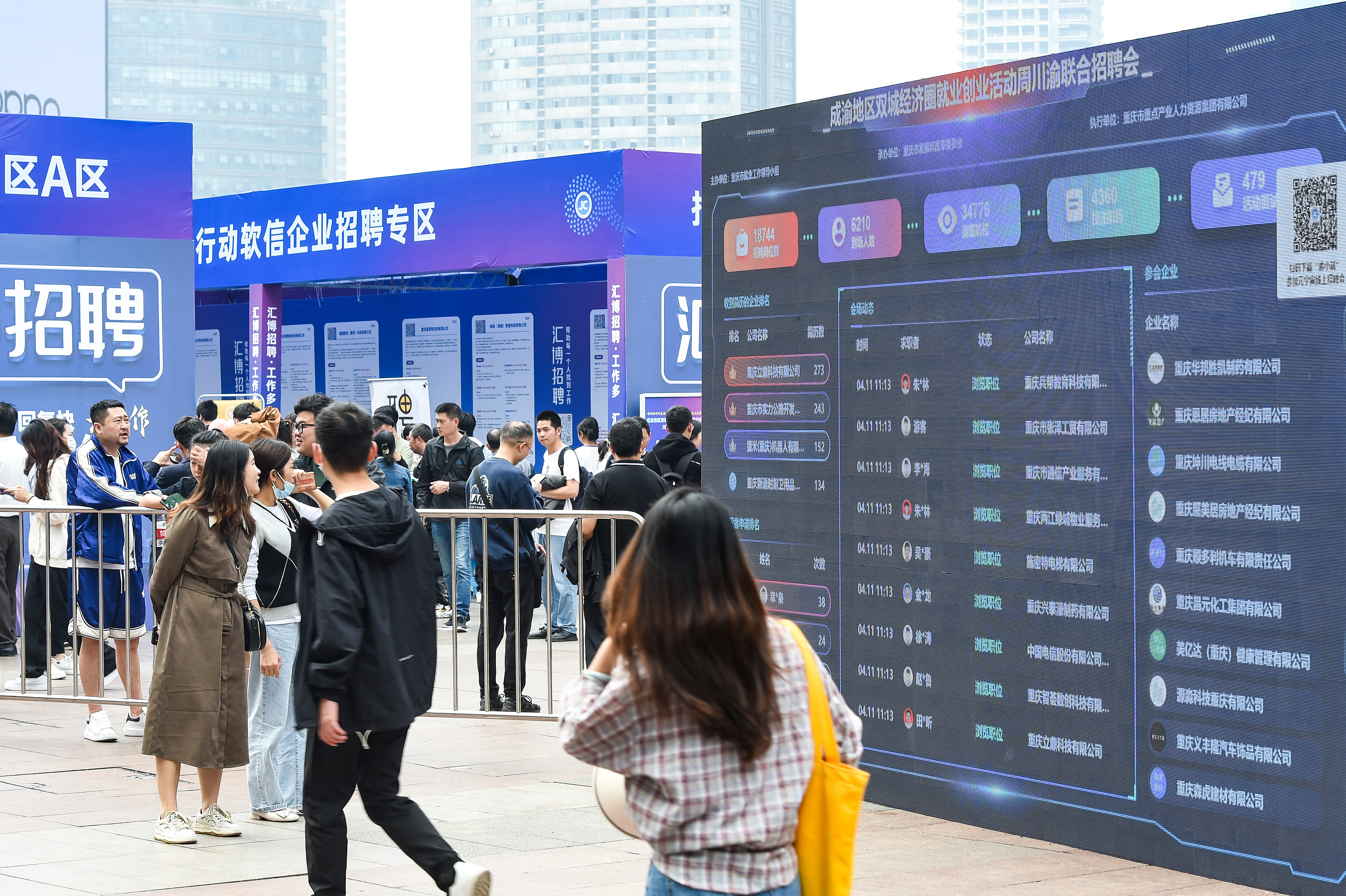 4月11日,重庆江北,成渝地区双城经济圈就业创业活动周川渝联合招聘会在观音桥步行街举行,吸引了一大批青年人前来应聘。何蓬磊 摄/视觉中国