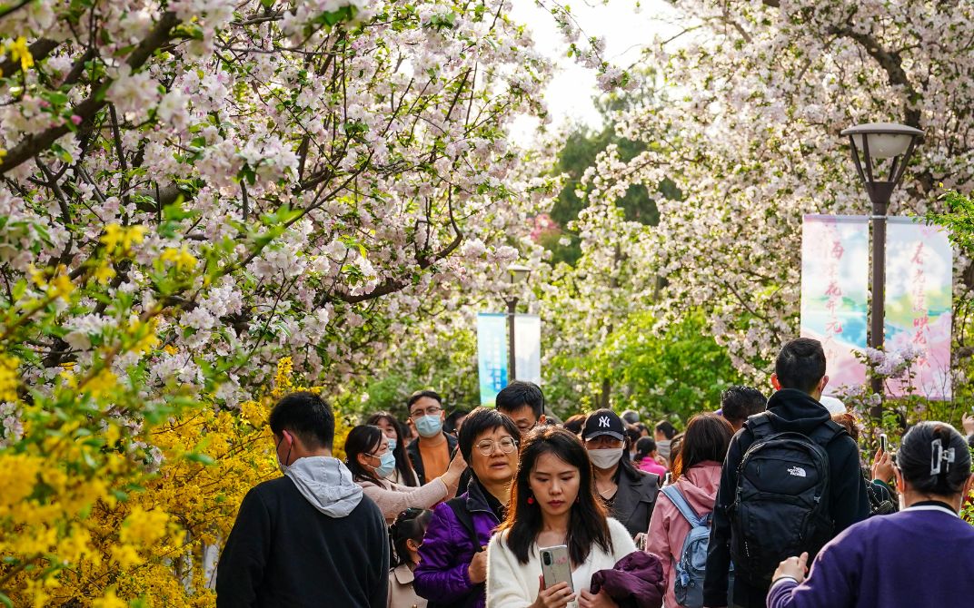 ▲4月5日,人们在北京元大都城垣遗址公园赏花。图/新华社