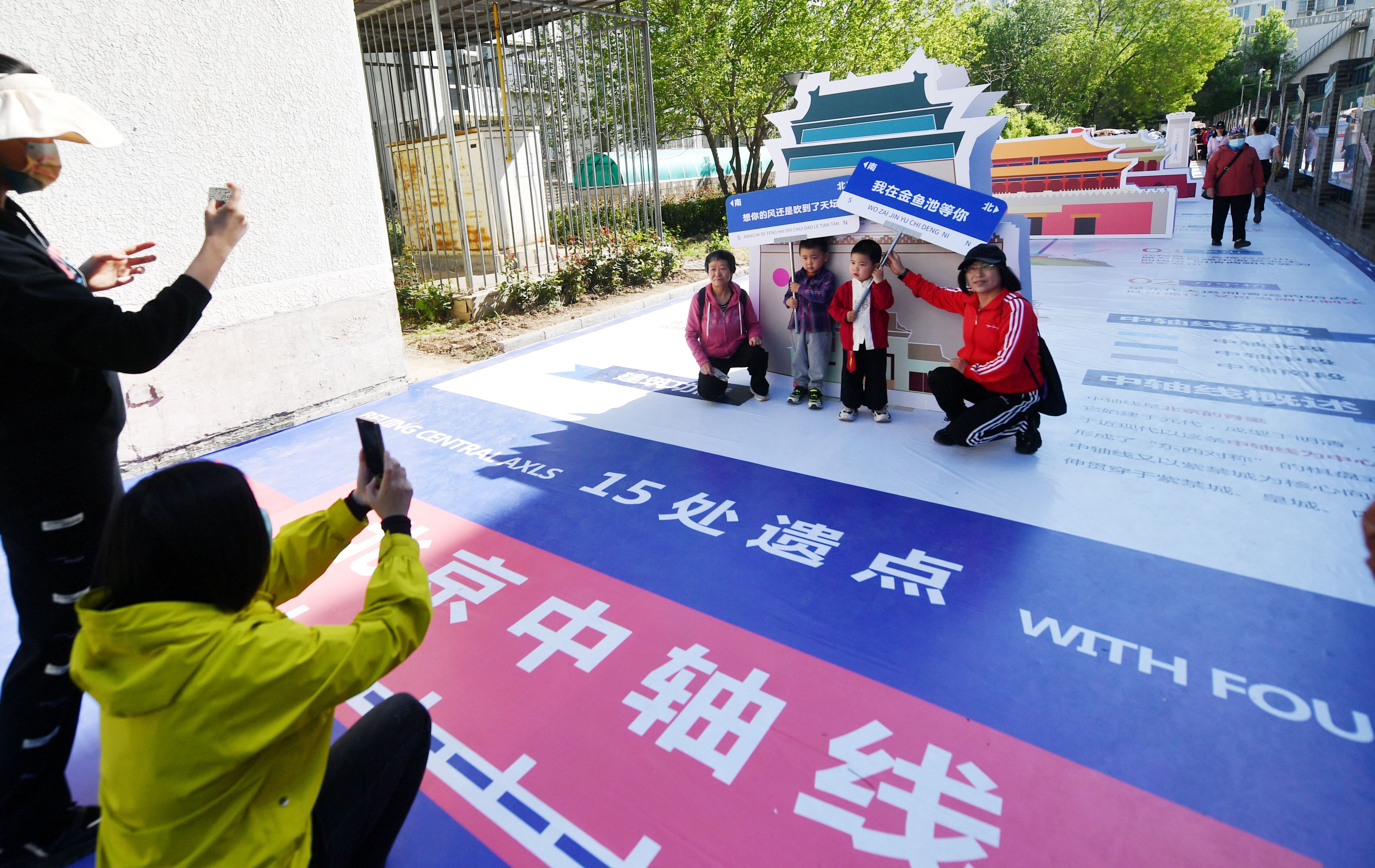 社区居民在中轴线打卡点拍照留念。 新京报记者 王贵彬 摄