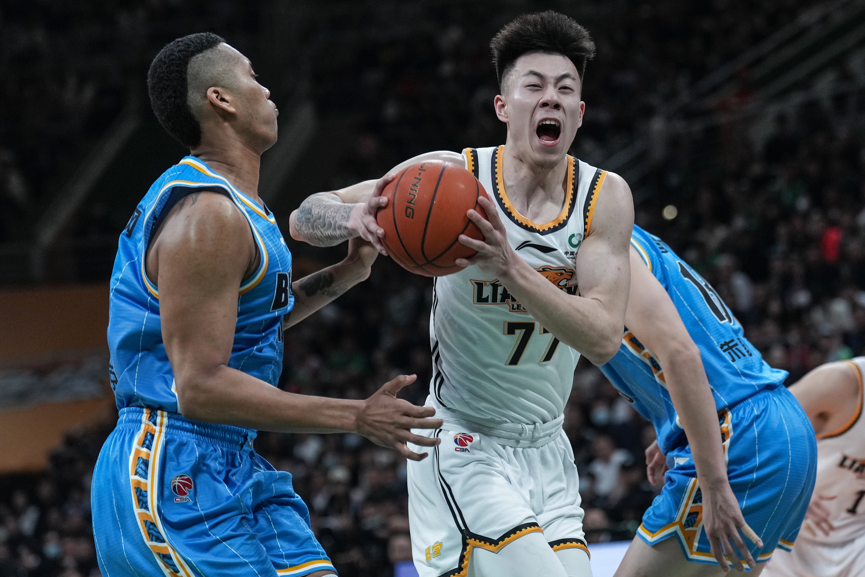 张镇麟(中)带球突破,此役他拿下23分。 图/新华社