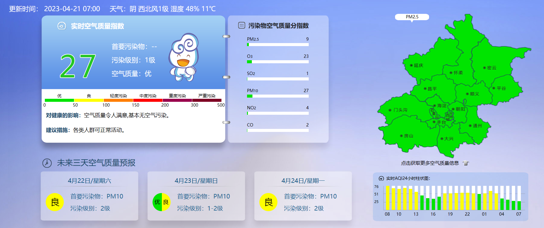 据北京市生态环境监测中心今早7时数据,目前实时空气质量指数27,污染级别1级,空气质量优。