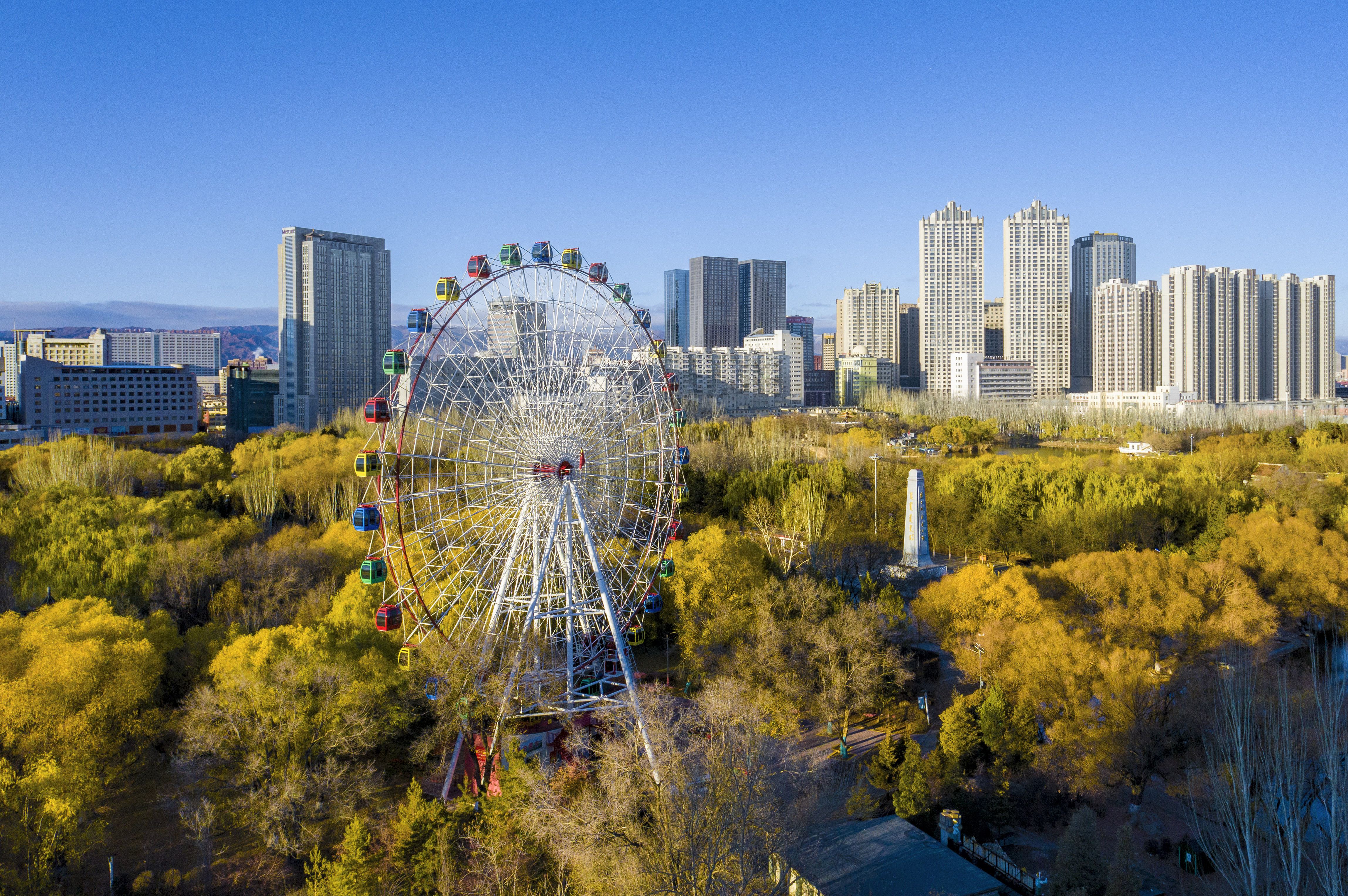 2022年11月12日,内蒙古呼和浩特,城市里的树木披上黄色,与蓝天白云、城市建筑相辉映,宛如油画,美不胜收。图/视觉中国