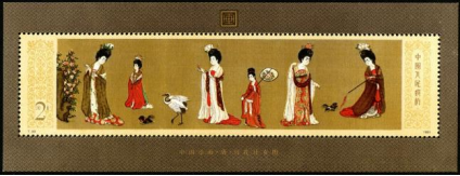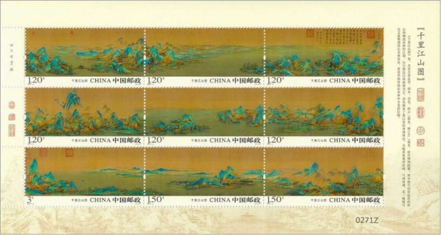 而这几百枚邮票里,最引人驻足的要属能藏下313首唐诗的邮票《唐诗三百首》。这套邮票的构图,采用了古代书卷的竖形样式,用中国山水古画做边饰,中间是6张相连的邮票,分别用李白的《下江陵》、杜甫的《望岳》、白居易的《琵琶行》、王之涣的《登鹳雀楼》、李商隐的《无题》、张九龄的《望月怀远》做图案,而另外307首唐诗,均隐藏在邮票周围。