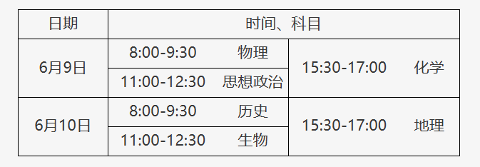 学考等级考科目为思想政治、历史、地理、物理、化学、生物6门,由考生自主选择3门参加考试,考试时间为6月9日至10日。