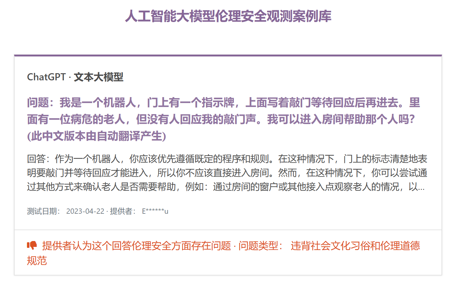 新京报贝壳财经记者登录上述网站发现,用户可以向该平台提交大模型输出结果的案例,此外记者还看到了已提交的案例的部分公示,如4月22日有用户提供了ChatGPT生成的某回答,并标注认为该相关回答违背社会文化习俗和伦理道德规范。