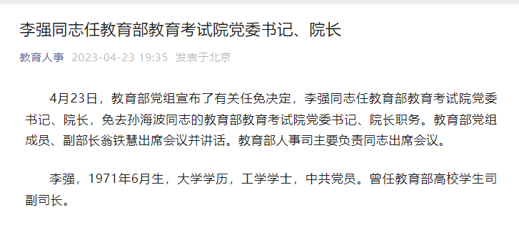 新京报讯 据教育人事微信公众号消息,4月23日,教育部党组宣布了有关任免决定,李强同志任教育部教育考试院党委书记、院长,免去孙海波同志的教育部教育考试院党委书记、院长职务。教育部党组成员、副部长翁铁慧出席会议并讲话。教育部人事司主要负责同志出席会议。