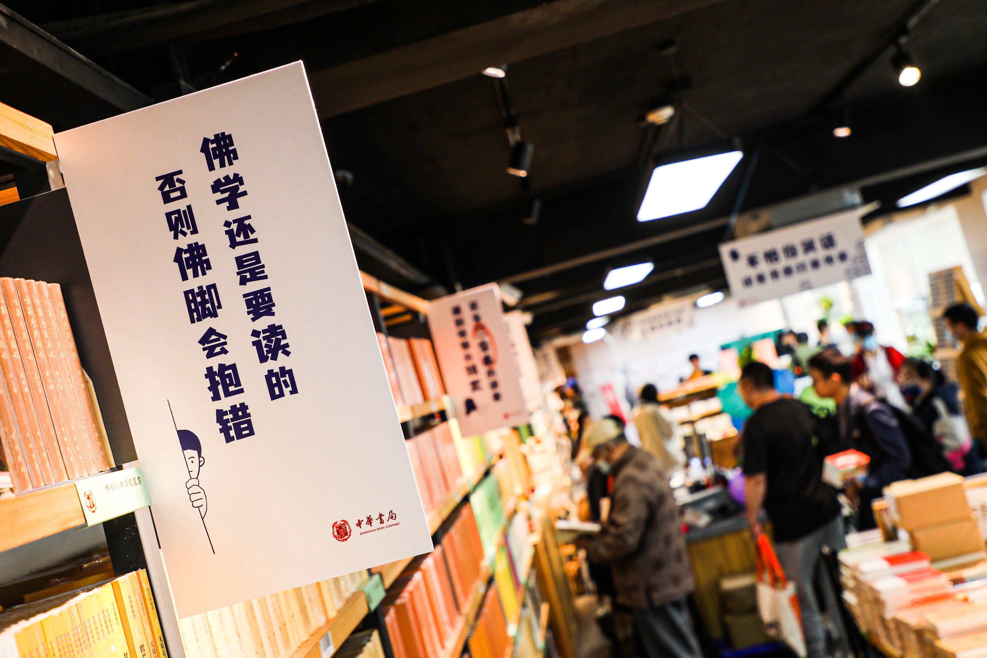 当天的伯鸿书店与往日不同,满室悬挂着诙谐幽默、字体新潮的标语,比如“前半生读懂,后半生躺平”,甚至还改编了名家名篇,创作出“我去买几个橘子,你在此选书,不要乱走”等标语。许多年轻读者拍照打卡,分享在社交媒体上。在书店的休息区,读者们三两围坐,边喝咖啡边读书,度过一段惬意时光。